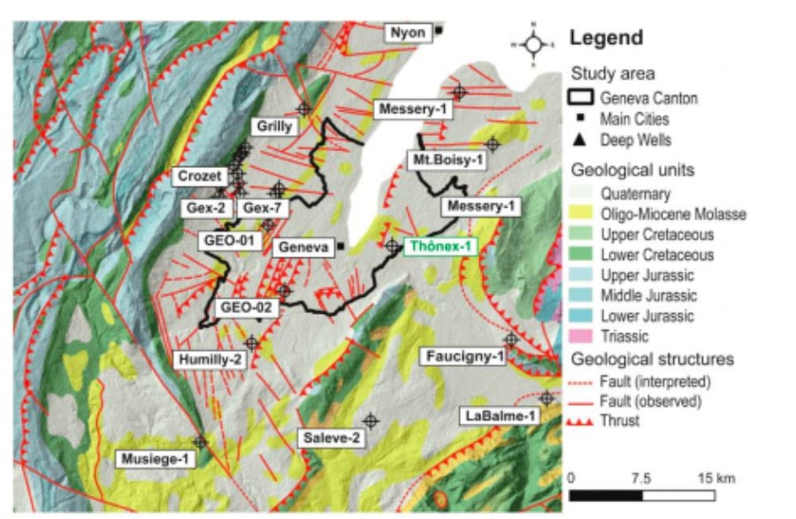Figure: Geological units with associated boreholes in the Geneva Basin. The well of Thônex chosen for this study is depicted in green. Modified after (Moscariello et al. 2020).